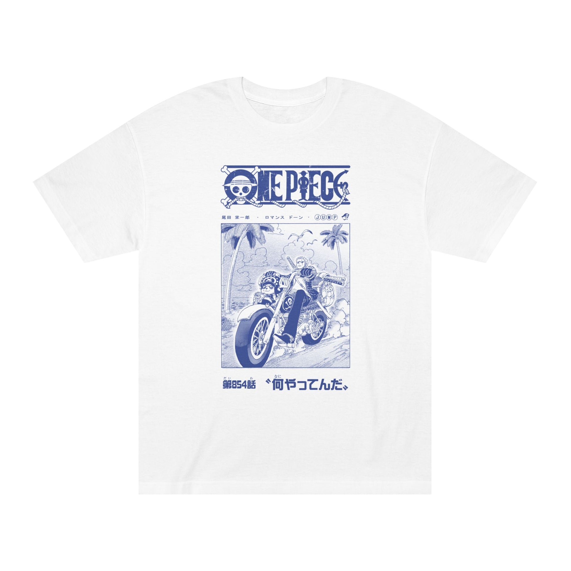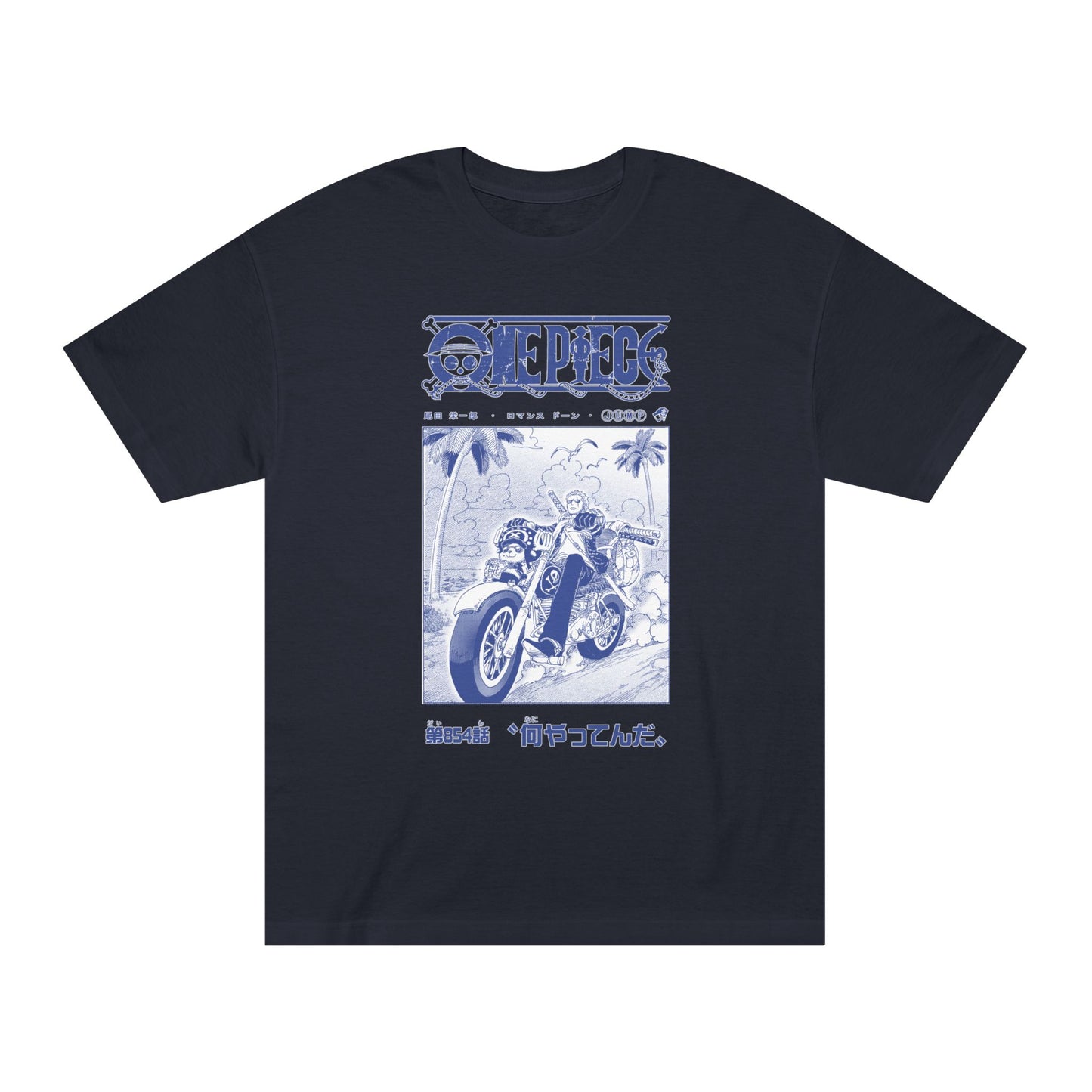 Made with 100% cotton, this tee is supremely soft while the classic fit makes it an easy-going choice for a number of occasions. Suitable as a pajama, gym shirt, or casual wear; featuring a swordsman and his favorite crew member.