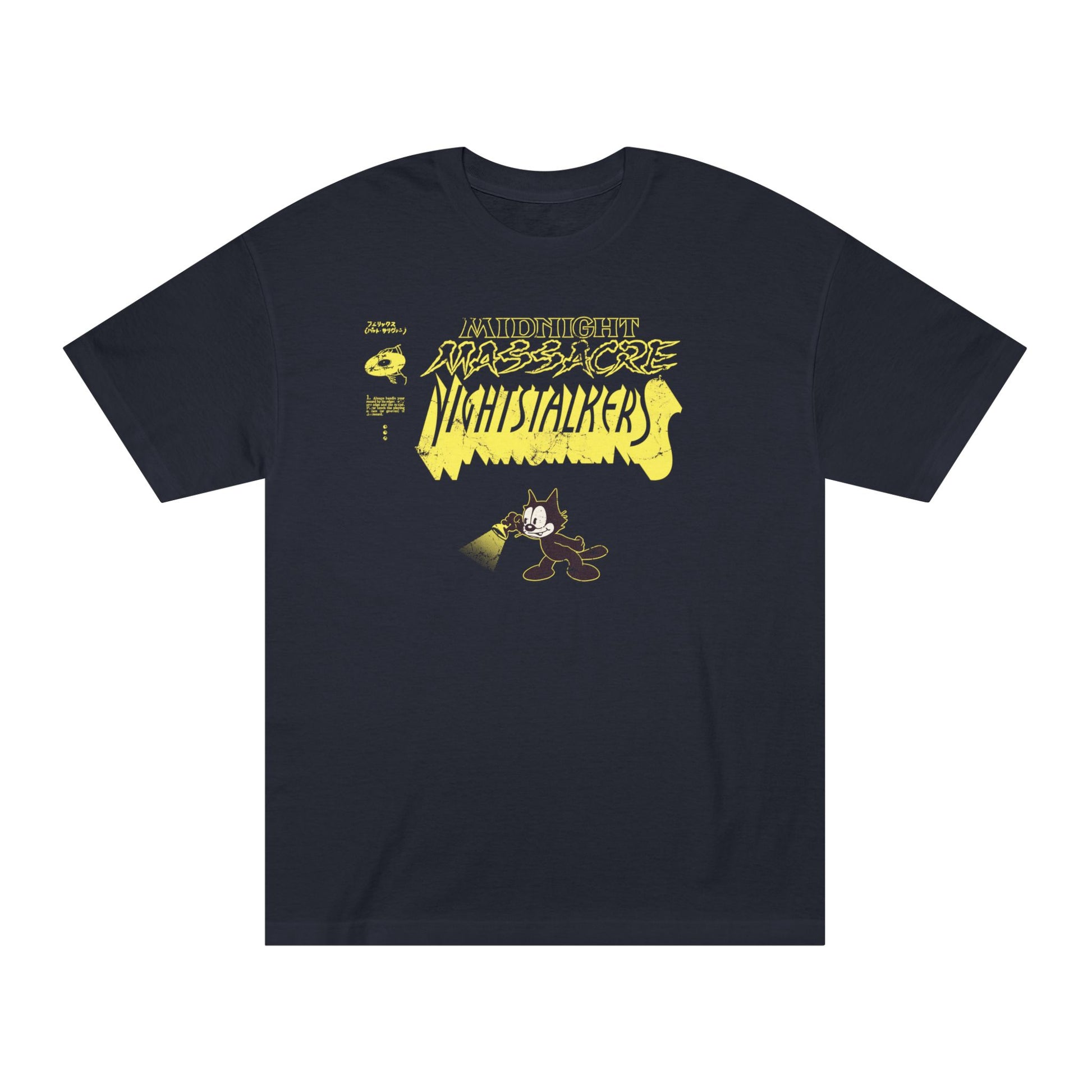 Made with 100% cotton, this tee is supremely soft while the classic fit makes it an easy-going choice for a number of occasions. Suitable as a pajama, gym shirt, or casual wear; featuring a cat looking in the dark.